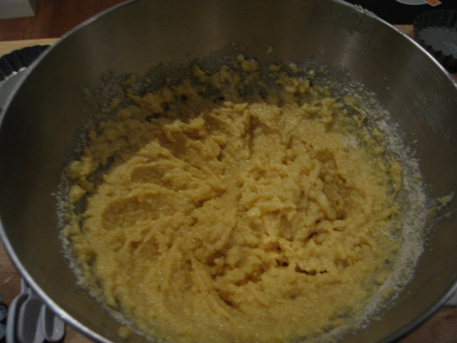 Cream butter and sugar together for about a minute or until the mixture is light yellow in color and very fluffy. Scrape down the side of the bowl and add the eggs, one at a time, beating well after each addition. The batter may appear to curdle. In the words of Douglas Adams: Don’t panic. Really. It’ll be fine. After all three are in, pour in the almond extract and mix for about another 30 seconds and scrape down the sides again. With the beaters on, spoon in the ground nuts and the flour. Mix well. The mixture will be soft, keep its slightly curdled look (mostly from the almonds) and retain its pallid yellow color.