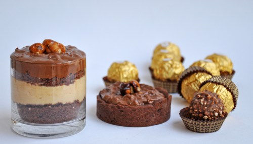 Drawing inspiration from Ellie’s beautiful Ferrero macarons, I decided to make a Ferrero Tart and Verrine, both desserts are perfect when you are looking for that additional extra to entertain during the holiday season and are made from the same components, just served differently. In true Ferrero form, this dessert is made with a chocolate tart, hazelnut mousse and topped with crushed candied hazelnuts enrobed in a chocolate and hazelnut ganache.