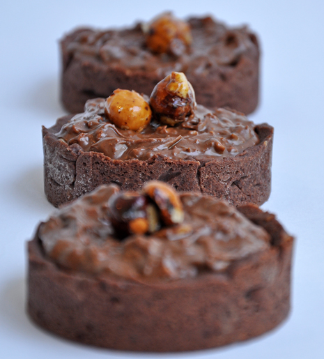 To assemble the tarts, pipe some hazelnut mousse on to the chocolate tart shells and then top with the Chocolate Hazelnut Thing and a few caramelized hazelnuts.
