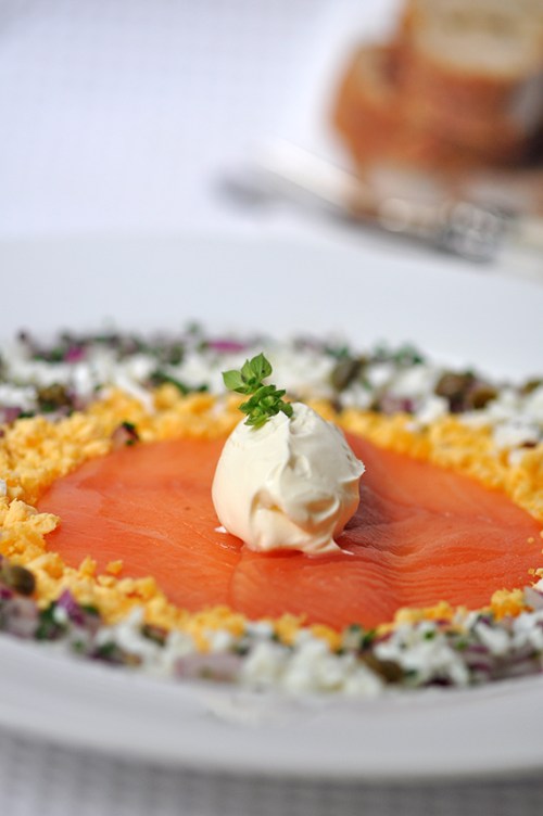 - Finally, lay a quenelle of sour cream over the smoked salmon.