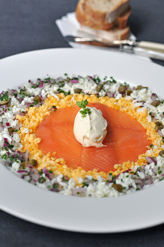 This Smoked Salmon “Tartare” was adapted from Thomas Keller’s Bouchon Cookbook. As you can see, it’s not really a tartare (as I did not chop the salmon finely as a tartare should be done) but it has all the makings otherwise. The recipe below is for one serving (of course!) but since this makes a very pretty starter, feel free to increase quantities if you are making it for guests.