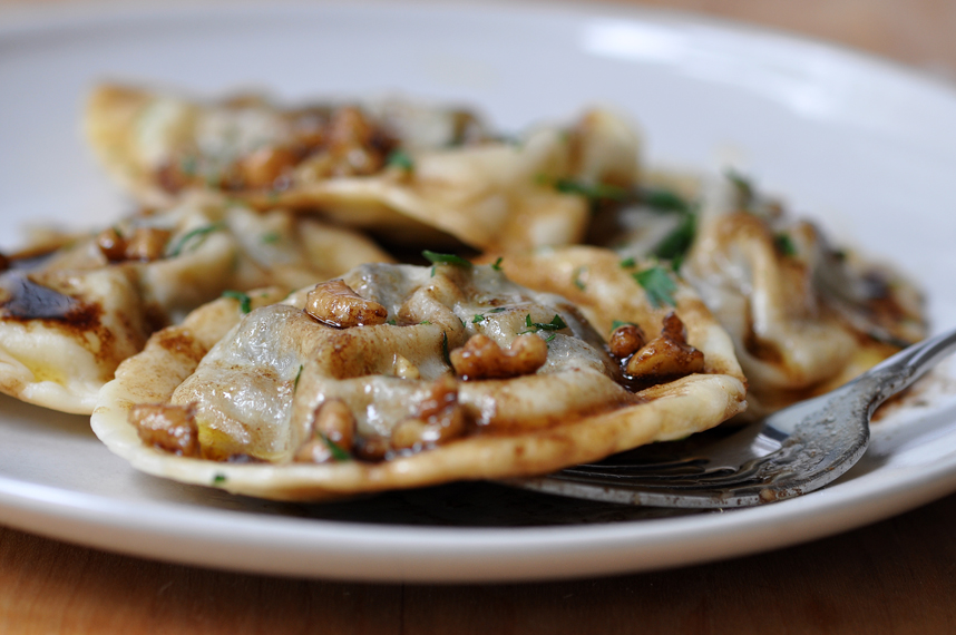 - When the butter is brown and foaming, add the pasta, balsamic vinegar and walnuts.