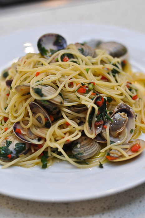 One of the unforgettable dishes we made that day was Maccheroni alla chittara con ragu d’agnello e peperoni. This was a typical dish from Abruzzo, where Eugenio’s family came from. The “chittara” is a special rectangular wooden board with wire strings attached to it. The sheets of dough are placed on the board and then a pressed through the strings with a rolling pin to create strands of pasta. The ragu, made with lamb and capsicums, is simply out of this world. My husband loved it so much that he went up to Eugenio to ask for seconds. And, as if two bowls wasn’t enough, tonight we made the ragu again using the freshly made rigatoni that the chefs at A Tavola gave us to take home!