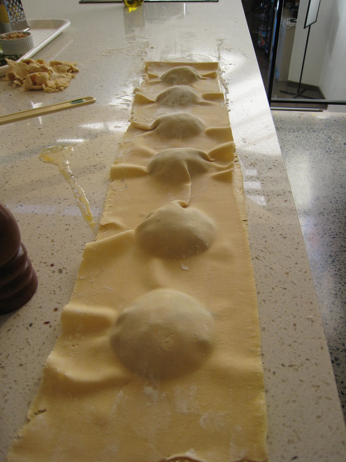 1. Using a pasta machine roll out the dough until a thin sheet is formed. Brush with egg wash and place some the ravioli mix along the sheet 3 centimeters apart.