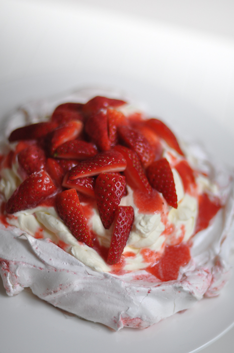 - To assemble, crumble the cooled meringue over the strawberries and cream and top with some raspberry sorbet, edible flowers and fresh raspberries.