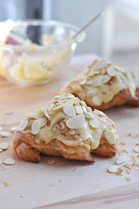 Anyway, these Almond Croissants are filled with an almond cream made with some creme patissiere, topped with more of the almond cream and sliced almonds and then baked until golden. To serve, they are dusted with some icing sugar. When reading about these gorgeous pastries, I discovered that they were originally invented as a way to use up old croissants.