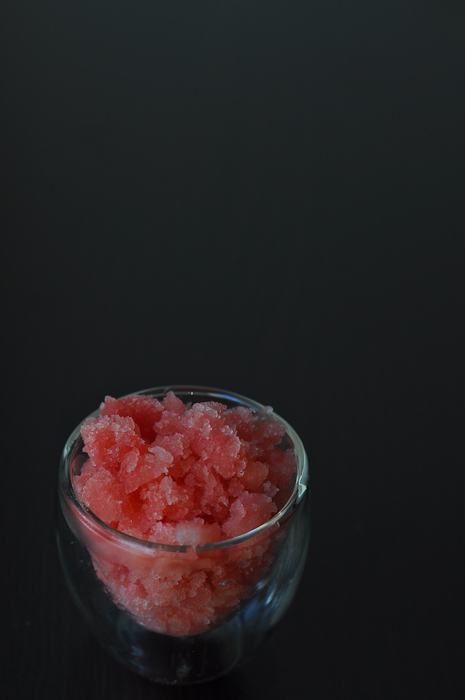 - To serve, place some granita in a chilled class, add the diced watermelon and pour some ginger syrup over it.